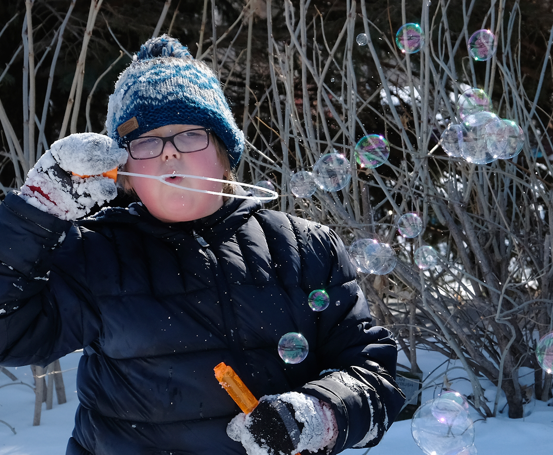 Boy in snow blows bubbles