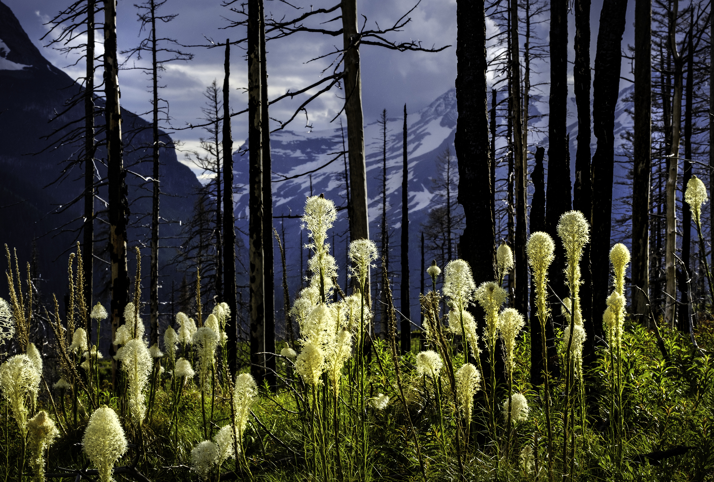 Bear Grass blooms among burned timbers
