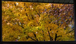 Maole trees through picture window.