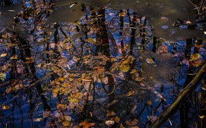 Leaves and reflections in pond