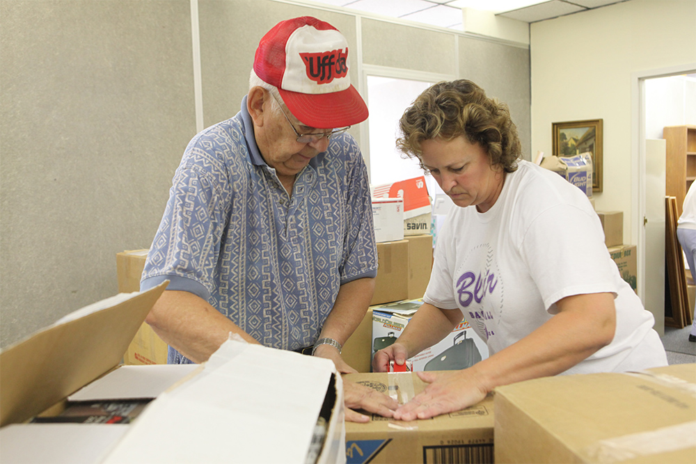 Bob Krogh and Sandra Ort Jensen tape a box of documents for transport.