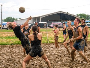 Kids play mud volleyball