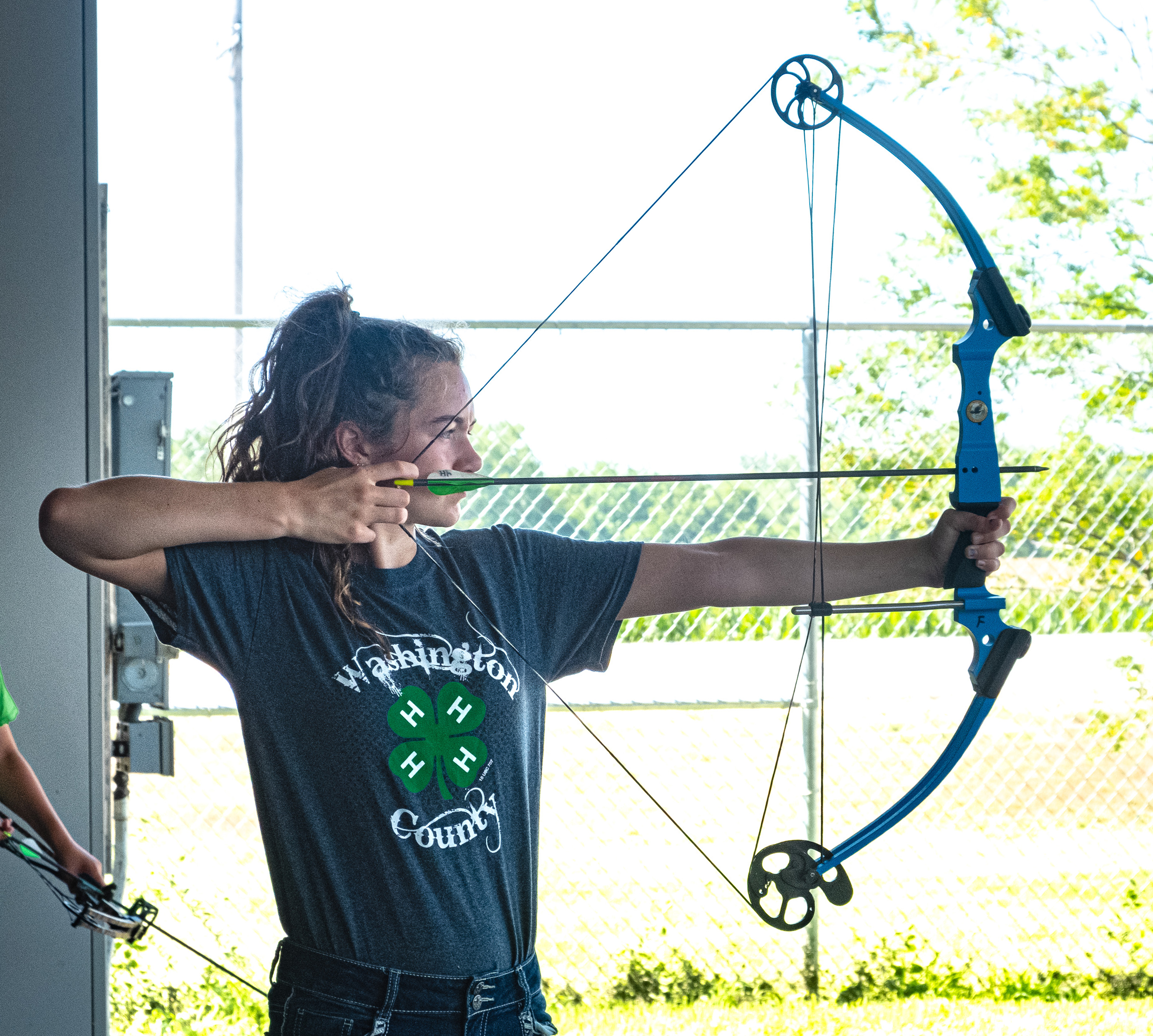 Girl shoots with bow and arrow.