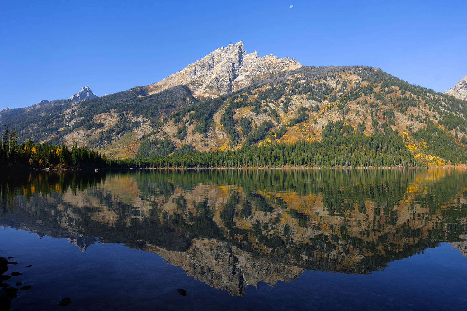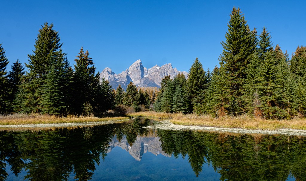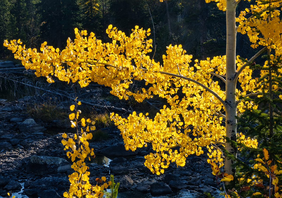 While there are many breathtakingly beautiful sites in the Rockies, I find the Tetons to be particularly grand. The mountain range is surrounded by lakes and the peaks tower sharply and dramatically above the arid plateau. I love to photograph layers of color-on-color, and such layers can be found in abundance in the Tetons. Hiking along trails I photographed compositions of sunlit aspen groves against multi-colored leaves and foliage a granite mountain backdrop. For several days a smoke haze hung low over the mountains. On those days I mostly hiked the trails and didn’t worry much about taking photos.