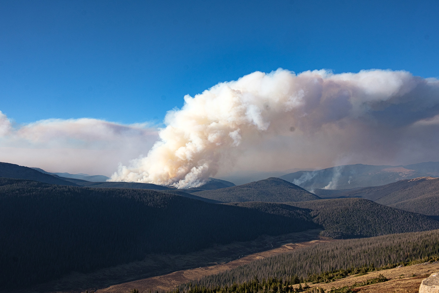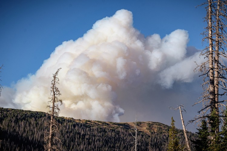On the night I arrived, I could see a big mushroom cloud of smoke above the mountain range. As I drove to the summit of Trail Ridge Road I could see the billows of smoke from the Cameron Peak fire on the northern boundary of the park, A ranger told me that the huge cloud of white smoke was from a controlled burn or back burn to stop fire from spreading into the park. As of last week, the Cameron Peak fire had burned well over 200,000 acres making in the largest fire in Colorado history. Multiple fires have resulted in the closing of national forests from west of Denver to the Wyoming Border. As of last Thursday, the fire had spread across the continental divide and parents of Estes Park were under evacuation.