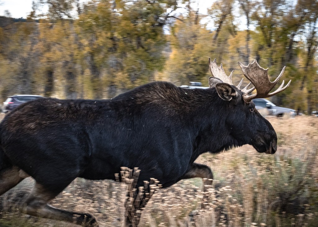 I spent the next five nights at Gros Ventre campground at the edge of Grand Teton National Park near Jackson,Wyoming. It is a large first come, first serve campground. When I arrived in the afternoon the campground was full, but the attendants allowed me and other camping units to park in the amphitheater parking lot at no charge so we could be first in line the following day. The staff at the campground was very pleasant, and many staffers appear to be retired seniors like me. The tent and RV pads are comfortably spaced apart and surrounded by Narrow Leaf Cottonwood trees and sagebrush. During my visit a variety of wildlife including moose, deer and moseyed through the campground.