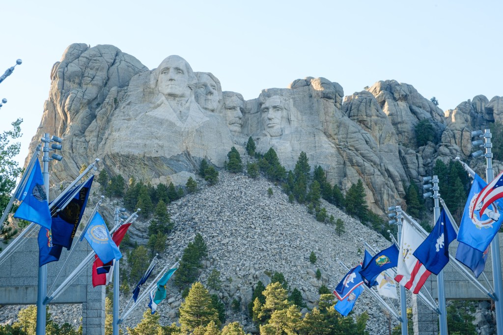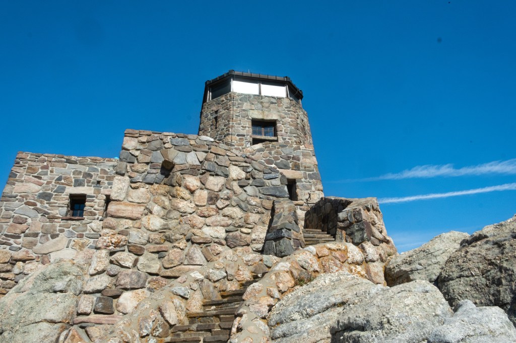 Above from top left: Inspiration Point along Needles Highway in Custer State Park. Top right: Stone fire tower constructed by the Civilian Conservation Corp in 1935 crowns the summit of Black Elk Peak. Bottom left: Thin eroded spires of granite along Needles Highway in Custer State Park. Middle: Mount Rushmore National Memorial. Right:Needles Highway in Custer State Park.