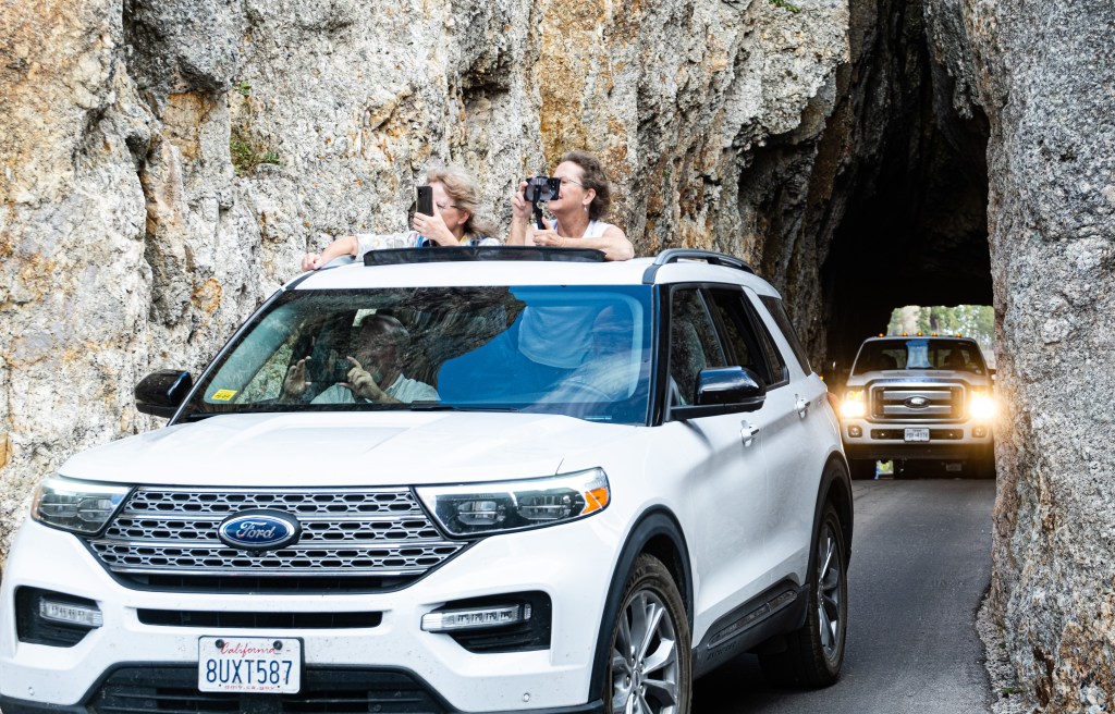 Below from left: Smith Falls campground along the Niobrara River. Right:Tourists enjoy the sun roof view of the tight squeeze though Eye of the Needle tunnel in Custer State Park.